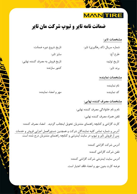 این شرکت درحوزه تامین و توزیع انواع تایرهای باری و سواری و بر اساس قوانین وزارت صمت، خود را ملزم به ارائه خدمات پس ازفروش و گارانتی به شرح ذیل (کارت گارانتی) مینماید: